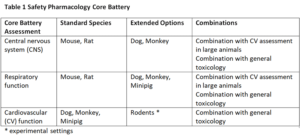 functions in relation to exposure in the therapeutic range and above(ICH, 2000). The core battery of safety pharmacology studies includes evaluation of the central nervous system (CNS), respiratory system, and cardiovascular (CV) function.